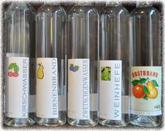 | Selbstgebrannte Destillate wie Kirschwasser, Birnenbrand, Zwetschgenwasser, Weinhefebrand und Obstbrand |