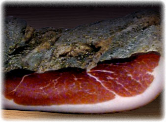 | Traditionell hart geräucherten Speck und zur Schlachtsaison auch Leber-, Blut- und Bratwürste im Naturdarm |